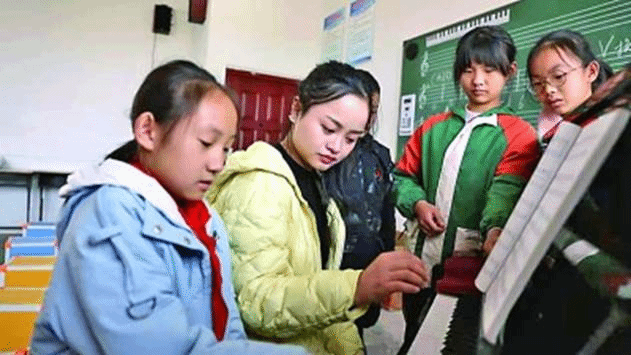 麻小娟(左二)在给孩子们上音乐课。 李采霏摄/光明图片