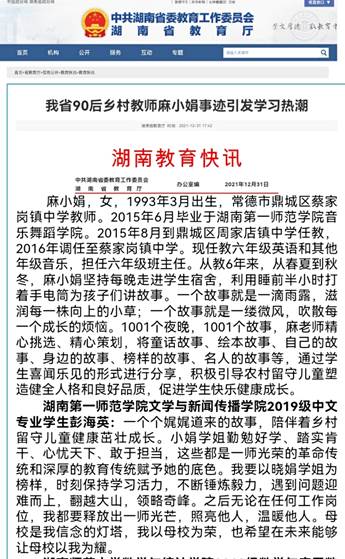 2021年12月28日,《光明日报》头版头条以《一千零一夜——90后乡村教师麻小娟用故事点亮孩子心灵》为题,以我校优秀校友麻小娟每日为孩子们讲故事为主线,用长达7000字的篇幅讲述了她毕业后扎根乡村教育工作的动人故事。报道后,全省乃至全国引发学习热潮,脱裤吧