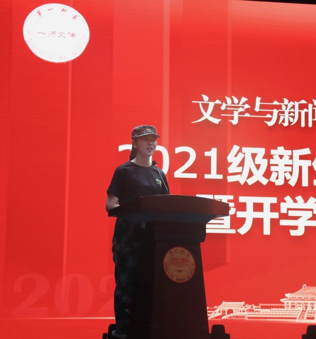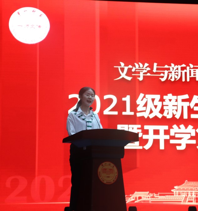 随后,新生代表2021级汉语国际教育1班孟醒、老生代表2018级汉语言文学2班陈婧先后发言。孟醒同大家分享了自己对大学新生活的见解。她表示,我们应自律自强,奋力攀登,应努力奋进,茁壮成长,要拥有强健的体魄和强大的心灵,行稳致远。陈婧寄语学弟学妹接纳自己,认识自己;找到目标,积极尝试;扎实成长,认真学习;发展自我,遇见新我。