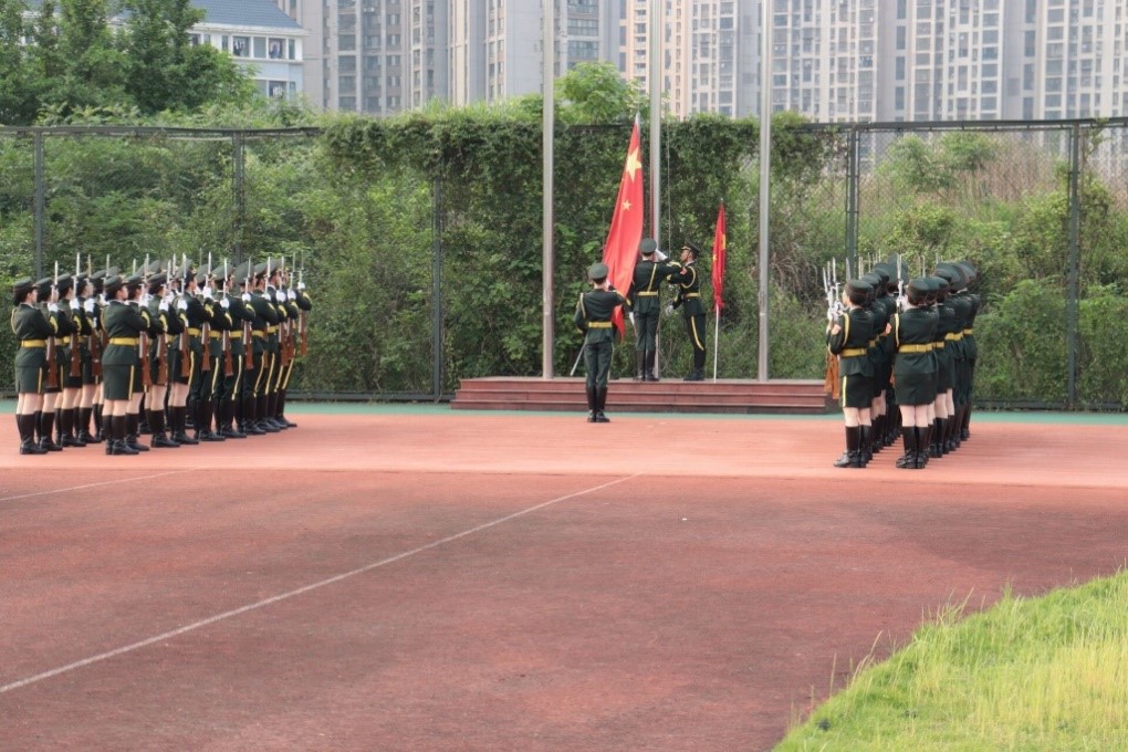 上午7点整,我校国旗护卫队迈着庄严而整齐的步伐走到旗台下。全体师生肃立,奏唱国歌,注视着五星红旗,伴着庄严嘹亮的国歌,五星红旗冉冉升起。