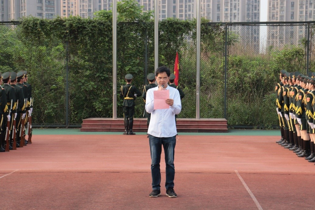 在田径场隆重举行升旗仪式。学院党总支书记佘向军、党总支副书记欧阳范剑、学工办主任唐科、全体辅导员以及2020级全体学生参加了升旗仪式。升旗仪式由党总支副书记欧阳范剑主持,党总支书记佘向军教授在国旗下发表讲话。