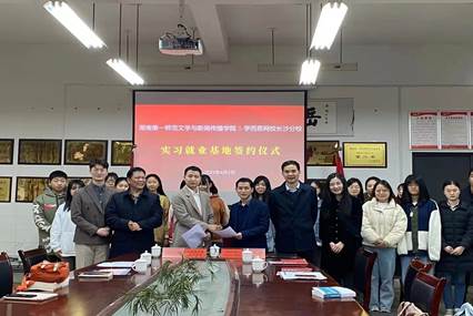 与学而思网校于玉衡楼201会议室举行了实习就业基地签约仪式。学而思网校湖南校企负责人刘坤、一师招聘负责人殷博文、脱裤吧