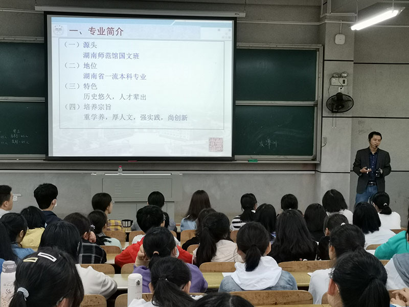 讲座就汉语言文学专业的发展源头、地位、特色、培养宗旨以及汉语言文学专业的课程设置等内容进行了详细讲解。主讲老师指出,汉语言文学专业历史悠久,可追溯至湖南师范馆国文班,长期以来秉持重学养、厚人文、强实践、尚创新的人才培养宗旨,是湖南省一流本科专业,至今培养了大批人才。主讲老师告诫同学们在校期间要养成爱读书的习惯,并分享了读书方法,他强调同学们首先要研读教材,打好专业基础,其次要多读经典好书,广泛涉猎各类知识,同时在阅读的过程中要多思考,深刻领悟书中的要义,并将知识充分化为自己的能力,提升自己的专业素养。