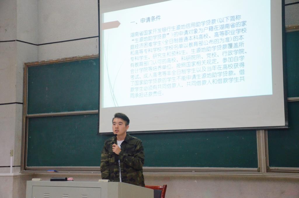 有需要的学生提供了资助渠道,解决了他们就学的后顾之忧。紧接着,安炜成老师为2020级新生介绍了奖学金评定的具体内容,涵盖了奖学金类别介绍、评选对象、评选条件、发放流程等多个方面。他在介绍奖学金类别的时候格外细致,意在鼓舞同学们认真学习专业知识,努力取得优异成绩,从而申请奖学金。此外,安炜成老师重点介绍了大学生应征入伍的相关政策,他从征集程序、优惠政策、部队发展前途等多个角度详尽介绍此政策,并且播放相关宣传视频,鼓励大学生积极响应国家号召,投身到保卫祖国的建设工作中。