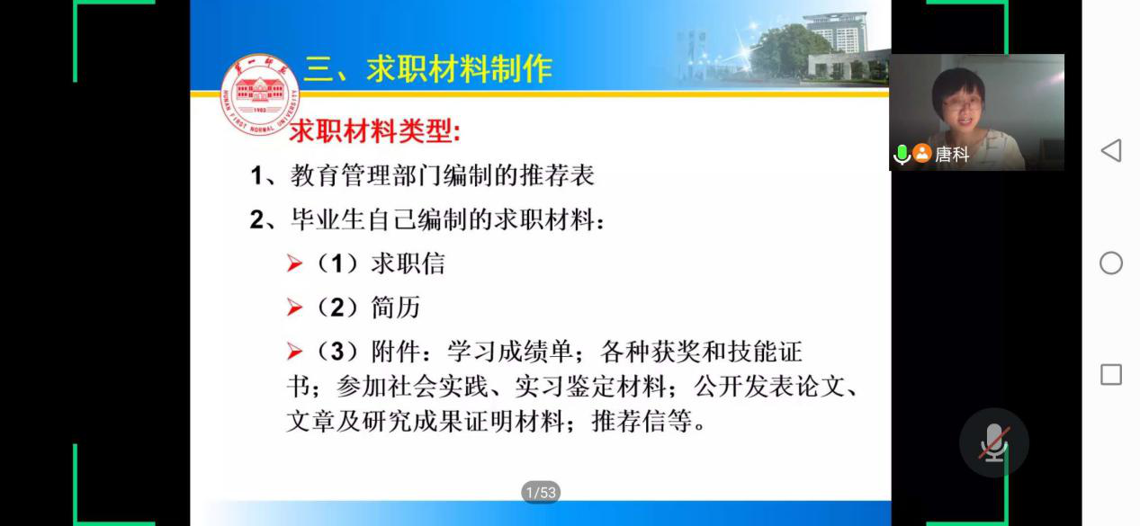 唐科老师以“就业定位与准备”为题,为学生们讲解了求职定位的策略、求职信息的筛选方法、求职材料的制作技巧、就业心理的调适方法,引导学生们根据自身特点找准就业定位,提前做好规范化、标准化的求职材料,树立正确的就业心理。