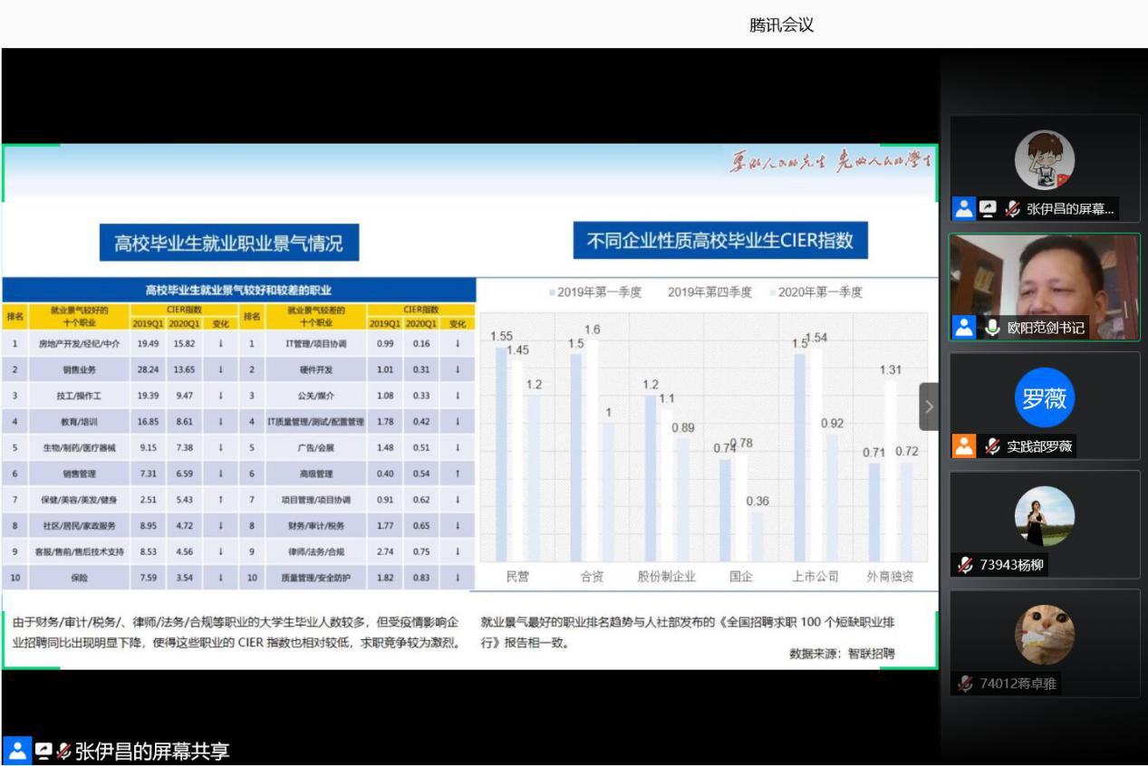 针对2017级学生举行为期两天的线上就业指导课。学院党总支副书记欧阳范剑、学工办主任唐科、就业专干赵雅兰分别为学生们讲授了以“就业形势与政策”“就业定位与准备”“求职面试与签约”为主题的就业指导课,引导学生们做好求职准备。