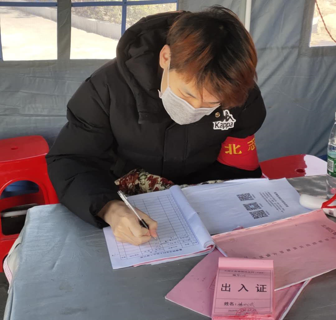 大三学生张梦婷作为一名入党积极分子也积极投身于村庄的抗疫工作,协助村干部在村口执勤,为每一个出入村庄的村民量体温,做登记,防止疫情向村庄蔓延。