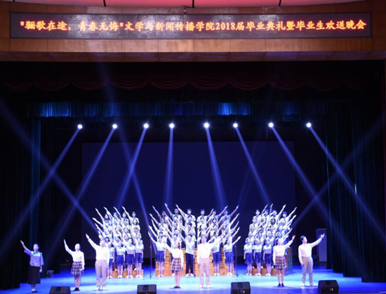 仪式结束后,毕业欢送晚会在学院啦啦队带来的开场舞《野蛮生长》中热烈开启,欢快的节奏和跳跃的音符展现出当代大学生的青春与活力。接下来依次是毛泽东经典诗词合诵、歌曲、戏剧、小品、情景剧等节目,充分展示了脱裤吧