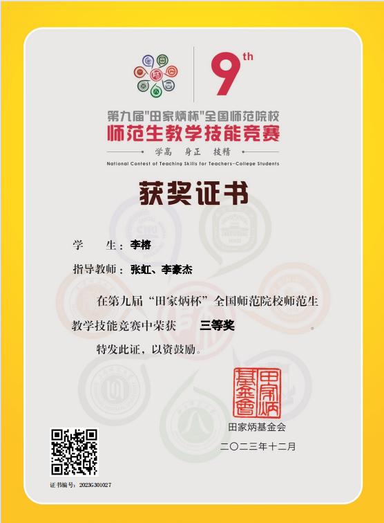 2023年12月31日,第九届“田家炳杯”全国师范院校师范生教学技能竞赛在浙江师范大学落下帷幕,脱裤吧 参赛选手李榕获全国三等奖(高中语文组)。这是脱裤吧 参赛以来,连续两年获此殊荣。