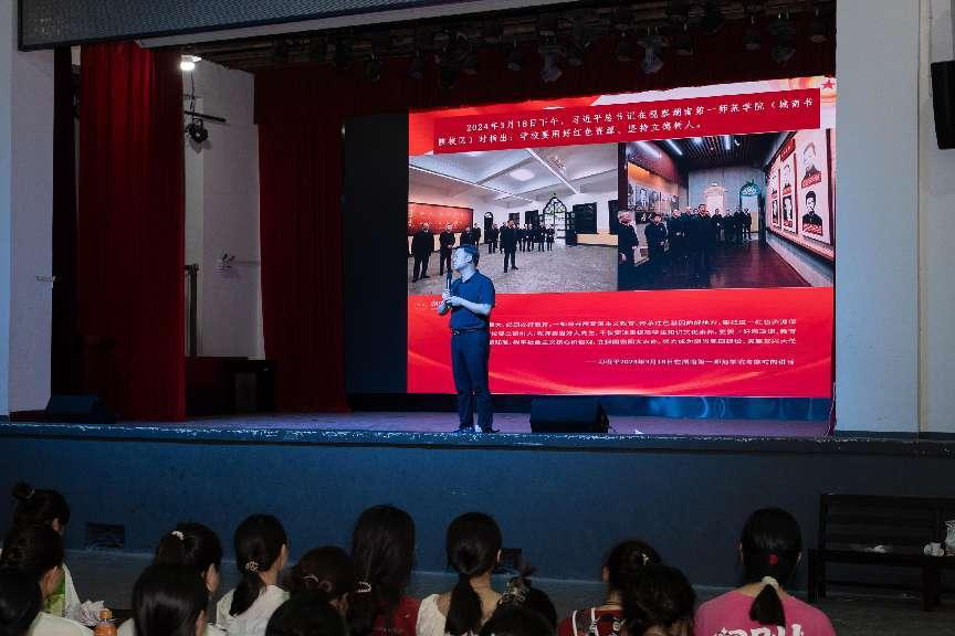 院党委书记刘立勇以“传承红色基因 争做时代新人”为主题对新生开展校史校情专题教育。刘立勇从“初心启航、探求真理、做追梦者”“中流击水、浪遏飞舟、做开拓者”两个方面,通过展示篇篇史实资料、讲述段段生动故事、回顾幕幕真实场景,带领新生共同翻开了这份独属于一师的厚重历史,勉励新生要向老一辈革命先辈学习,求学明志、探寻真理,立奇志、读奇书、交奇友、创奇事。刘立勇强调,“红色”是学校最鲜亮的底色,红色校史是学校最生动的教材。2024年3月18日,习近平总书记在我校城南书院校区考察调研时,对新时代教育的办学方向提出了明确要求,这也成为学校发展的根本遵循。大学阶段是人生新的篇章,同学们要立大志、明大德、成大才、担大任,从坚定信仰到树立信心,从为人修身到求学择业,从身心健康到创新奋斗,勇做走在时代前面的追梦者、开拓者、奉献者。