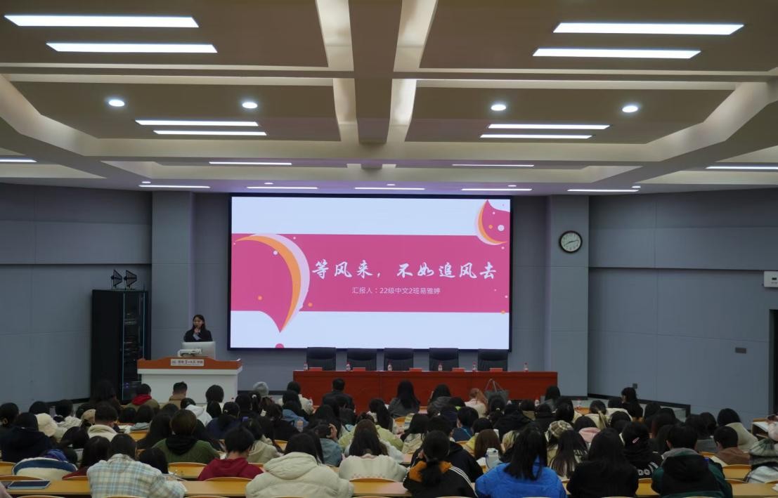 大会议程第二项,先进班集体代表22级润之英才班班长周琪淇、23中文2班班长谢杭彤介绍班级建设经验。周琪淇同学从“学业成绩、学科竞赛、志愿活动、公寓建设”四个方面,分享本班学风建设经验,鼓励同学们“学思并进、知行合一”。