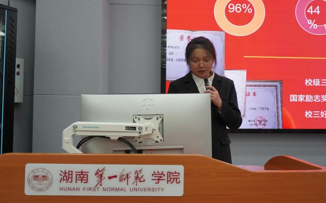 谢杭彤同学分享了班级学风建设经验,提倡发扬“团结务实、卓越创新”的文传优秀学风,将学风建设放在班级建设的首位。