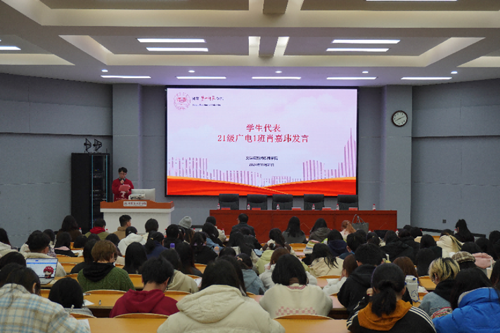 优秀学生代表21级广电1班肖嘉玮、22级中文2班易雅婷分享了各自的学习经验。肖嘉玮同学从“以学筑梦、以学促行、以学明德”三个方面,强调实践行动的重要性,他提出“想多了都是问题,做多了才有答案”,鼓励同学们在零成本的容错环境下大胆尝试、大胆创新。