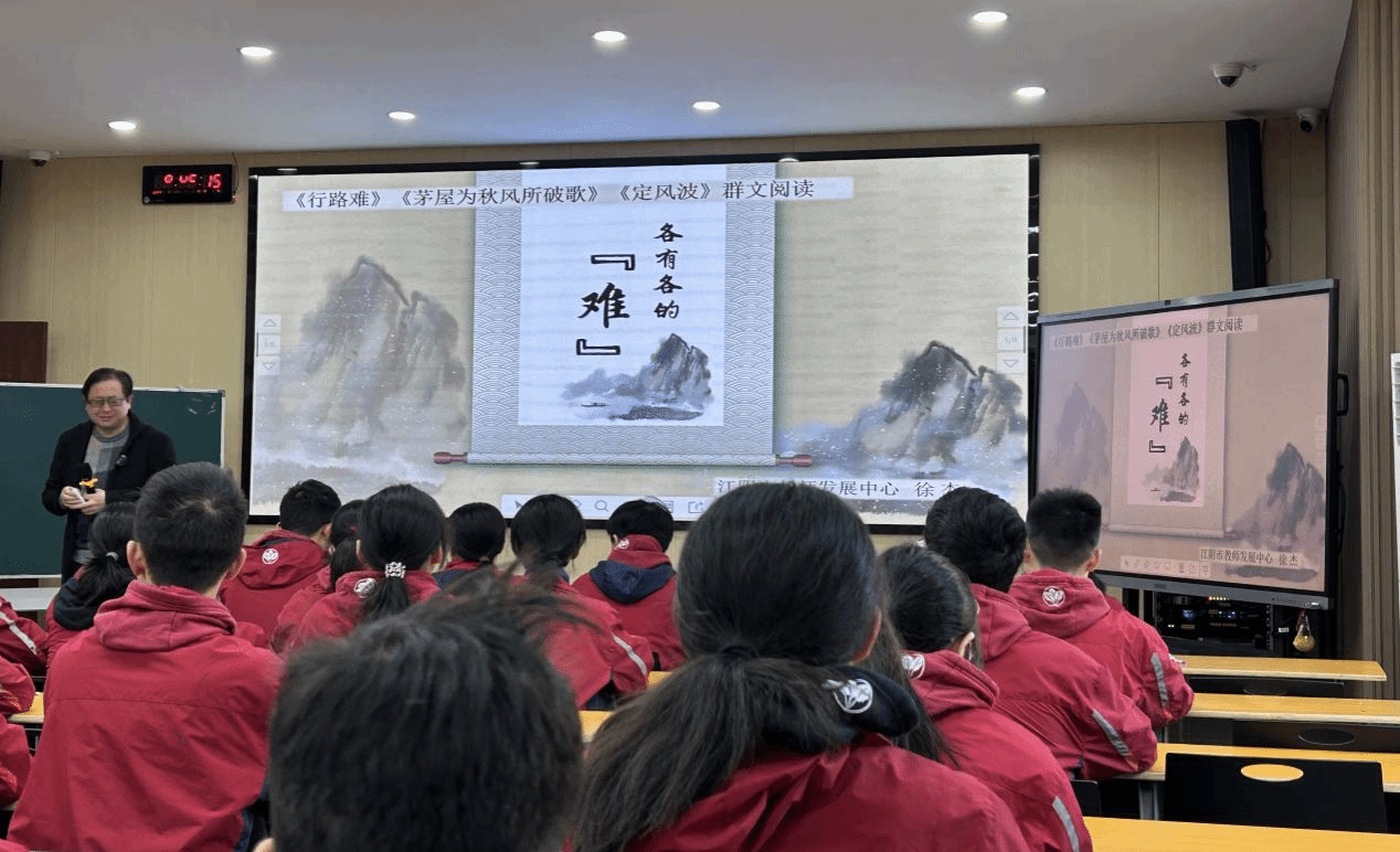 3月17日上午的示范课,邀请了全国特级教师徐杰。徐杰老师是江苏江阴市教研员,“精致语文”首倡者,曾11次获得全国中学课堂教学大赛特等奖、一等奖。本次示范课为群文阅读,主题是《各有各的难——古诗文连读》,结合初中语文八、九年级教材中的《行路难》《茅屋为秋风所破歌》《定风波》三篇经典范文,通过对比作品中呈现的诗人价值追求、人生态度及儒道精神,引导学生感悟“困境中的生命力量”。学员们课后不由赞叹到:“这种跨文本联读不仅启悟了学生对三位诗人精神内核的深度理解,更让我们明白优质课堂如何通过老师的精导妙引,涵养学生的人文精神,促进学生自主学习、探究学习的效度与深度,真正体现语文课的价值追求。”