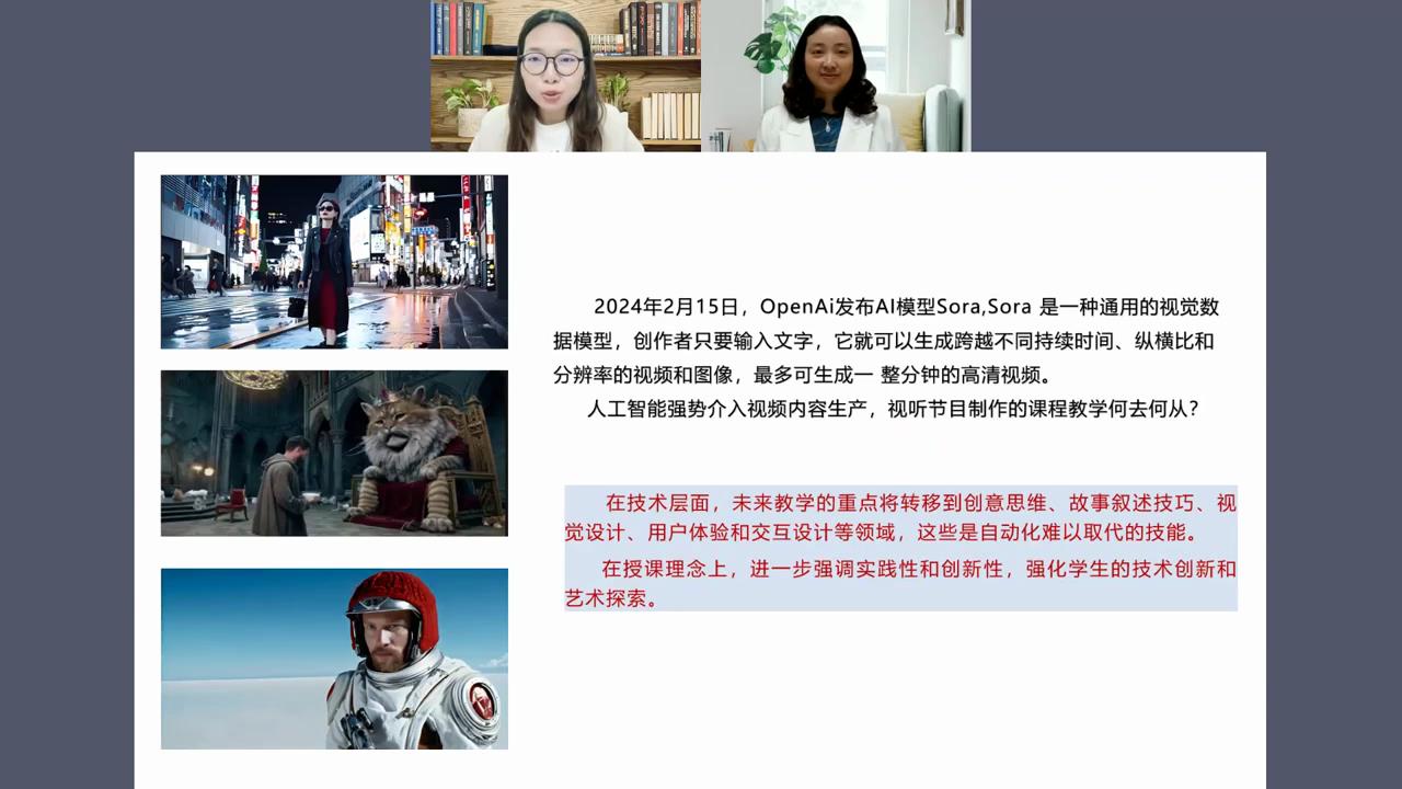 此次直播分享上,谢杰老师以“激活创意,知行合一”为题,向老师们详细的介绍了《新媒体视听节目制作》课程建设的基本情况,分享了“以项目制为核心的线上线下混合式教学”的成功经验,并针对生成式人工智能介入下的影视创作类课程建设提出了自己的思考。