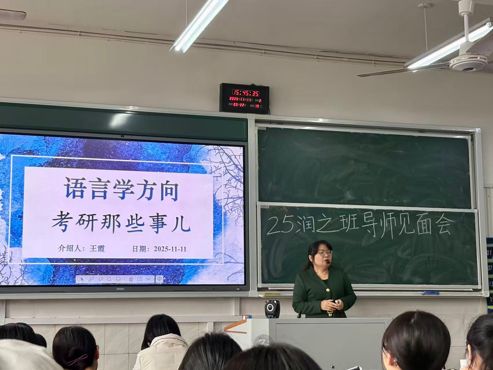 会议伊始,张惠教授对出席本次见面会的导师进行逐一介绍。卢阿涛博士、李柳情博士、杨水远博士、石沙西博士、王霞教授、张虹博士依次发言,分别对中国现当代文学、古代文学、文艺学、比较文学与世界文学、语言学和学科语文等学科方向进行了系统介绍。诸位导师不仅精准剖析了各专业的核心内涵、学术资源与师资力量,更结合考研动态、真题体验与就业前景,为同学们勾勒出清晰的学习路径与成才蓝图。杨水远博士寄语同学“不要怀疑知识的有用性,将知识变成我们的血肉”,张虹博士将培养卓越教师比喻为培养“顶级厨师”,妙语警言使在座学子受益匪浅。